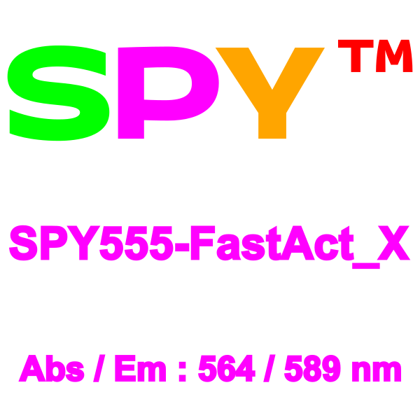 SPY555-FastAct_X enables multicolor imaging with SPY505, SPY595, SPY650, SPY700, SiR and GFP. SPY555-FastAct_X can be imaged with standard Cy3 filterset. It can be used for widefield, confocal, SIM or STED imaging of living cells and tissue. Probe quantity allows 100 staining experiments.*